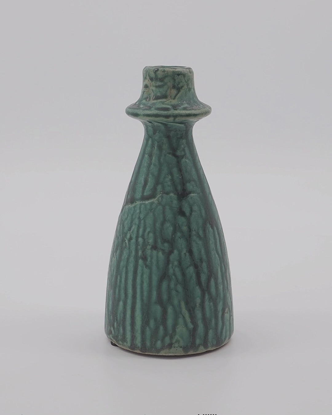 Handmade from terracotta, this candle holder brings a rustic charm with its reactive glaze reminiscent of aged copper. Perfect for taper candles, it adds a touch of artisanal elegance to any space, whether displayed alone or combined with other sizes.