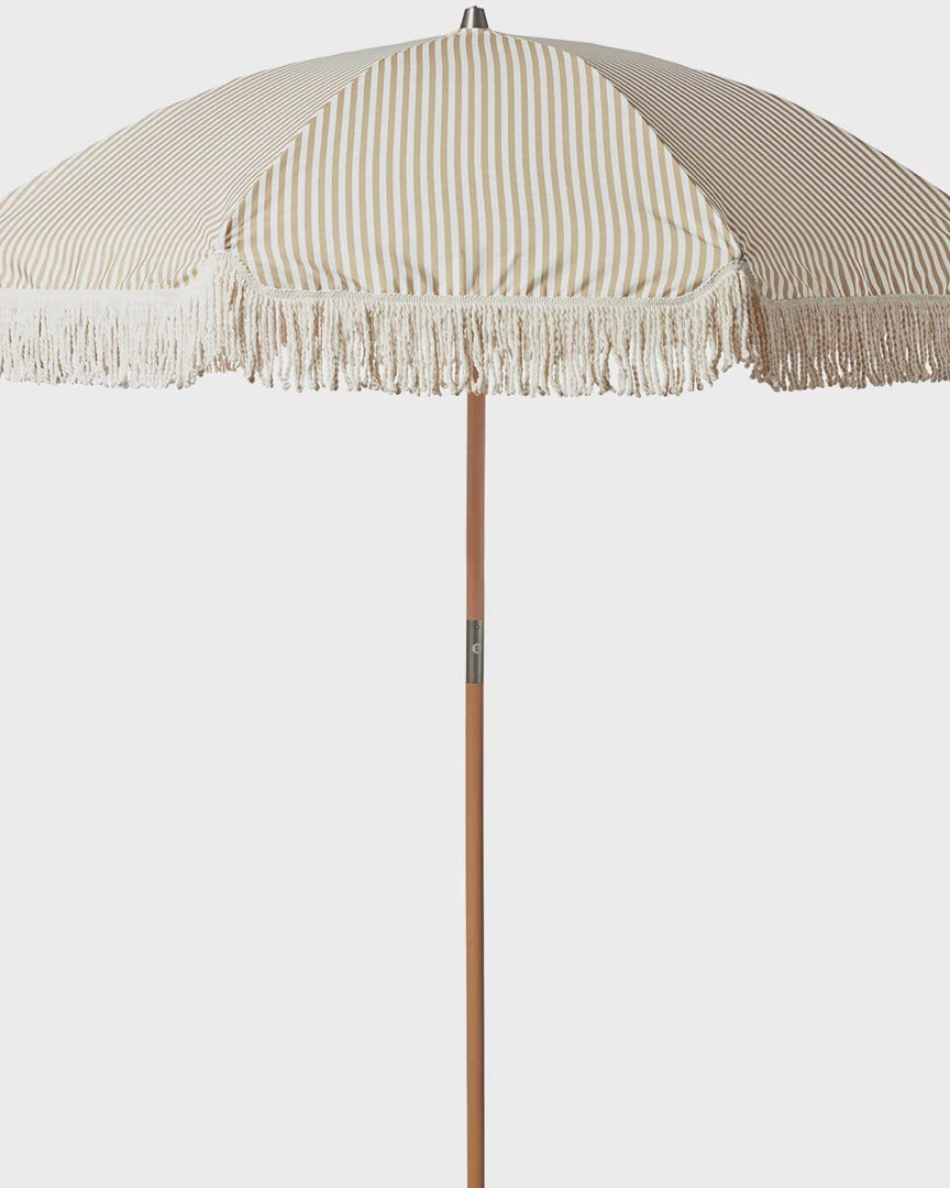 A great width and height for a backyard umbrella. Timeless stripes in off white and sandy ochre. Vintage style fringes fringes add the finishing touch. A lovely additionn to your courtyard or deck.