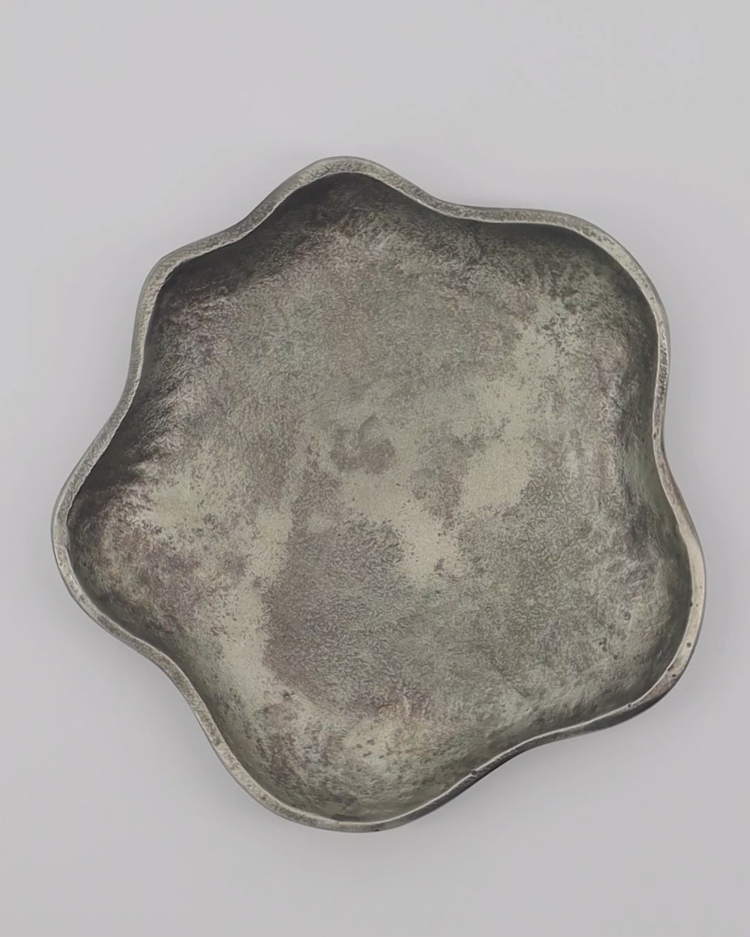 With its antique black finish, this handmade aluminium tray adds a touch of sophistication to any setting. Perfect for decoration or serving, its organic shape and unique craftsmanship make it a stunning piece for your home.